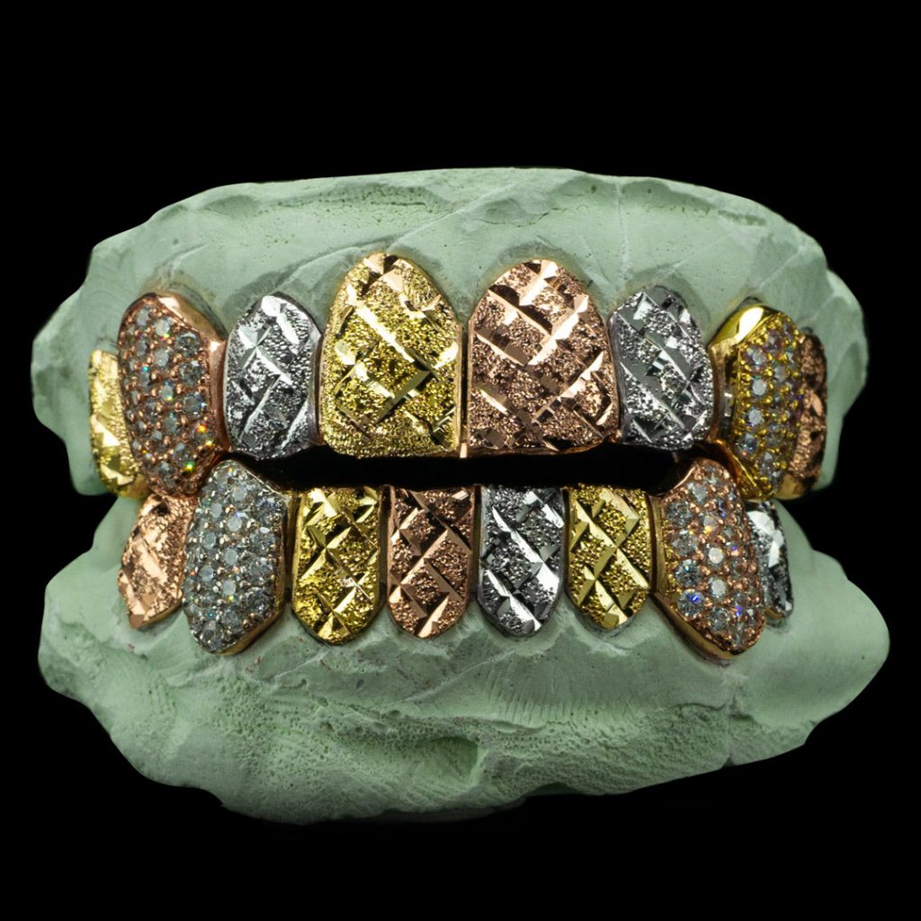 Tri-Color Diamond Cut & Diamond Dust with Iced Fangs Grillz