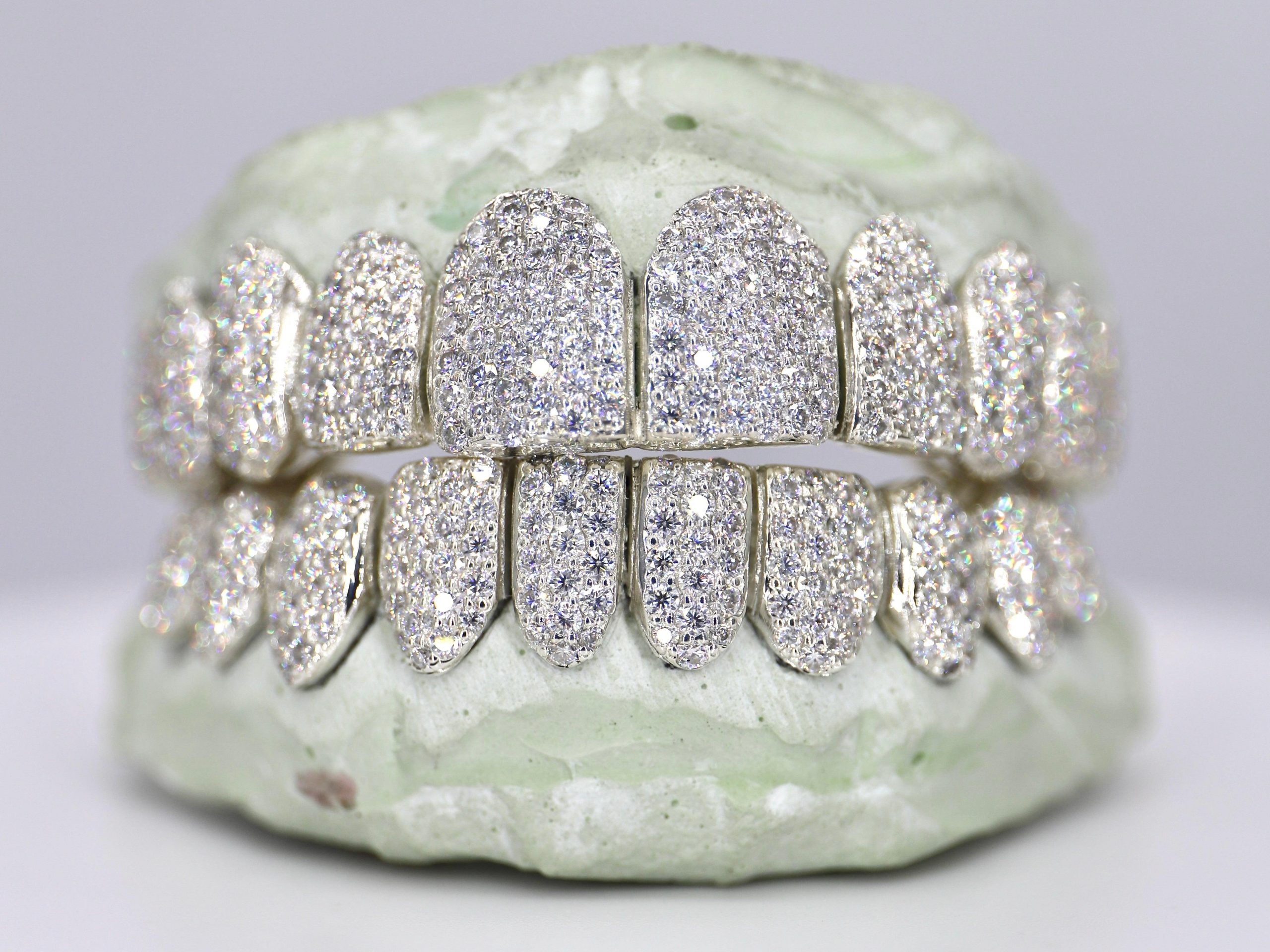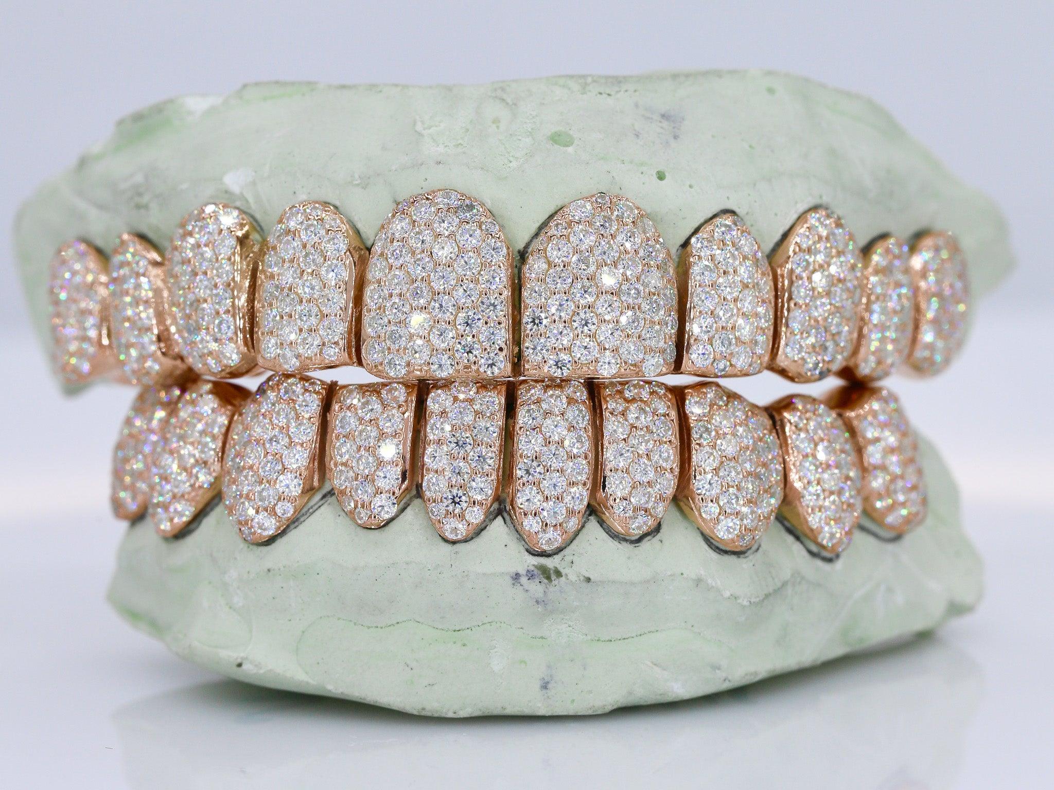 Custom Grillz Hand Set Moissanite Diamonds Top OR Bottom. These stunning pieces are a true work of art, featuring Moissanite diamonds of the finest quality and hand-set with the utmost attention to detail.