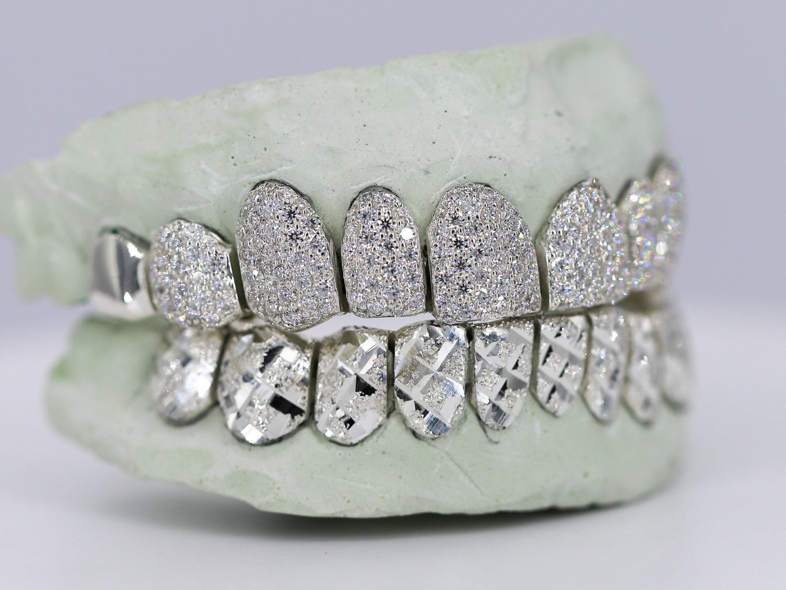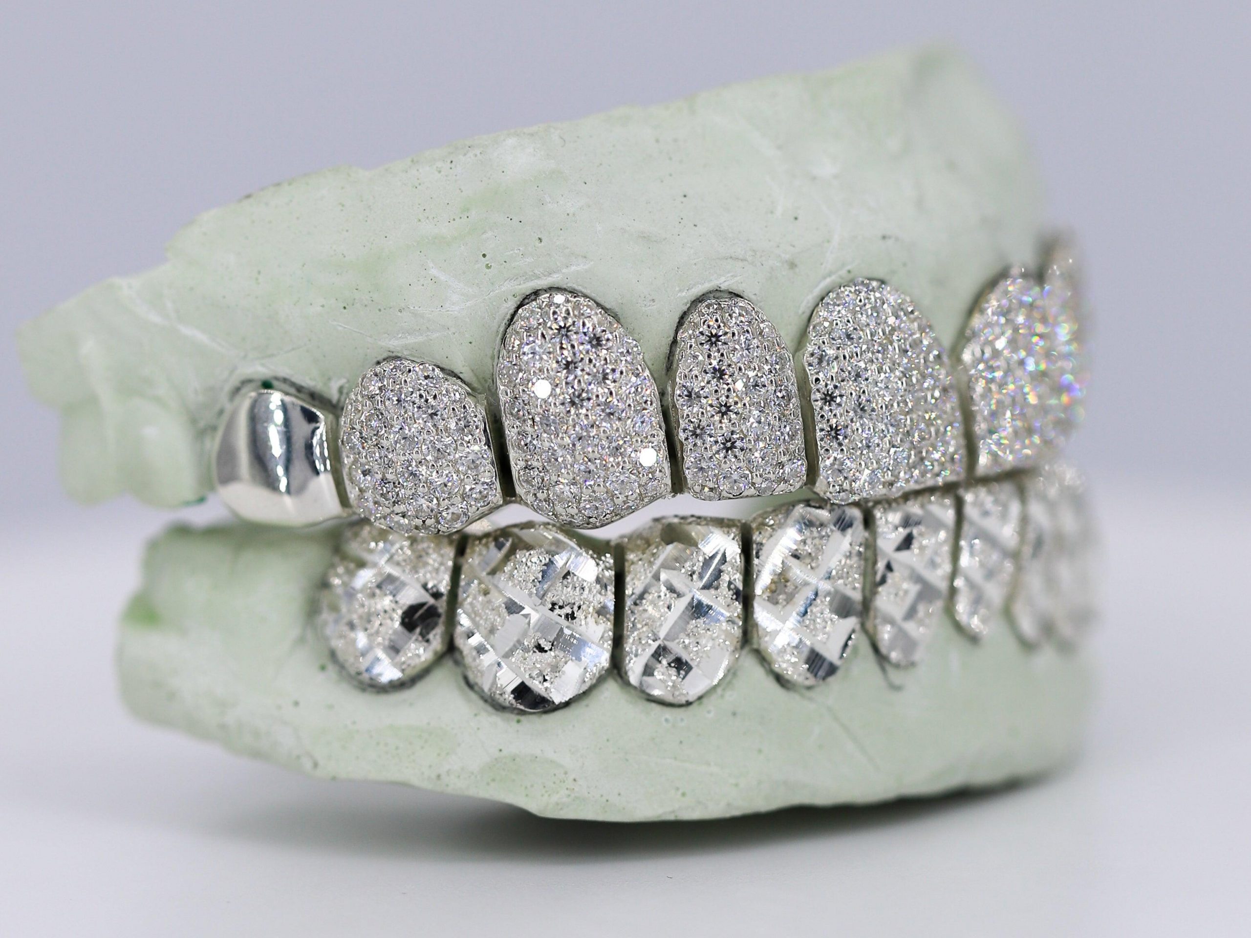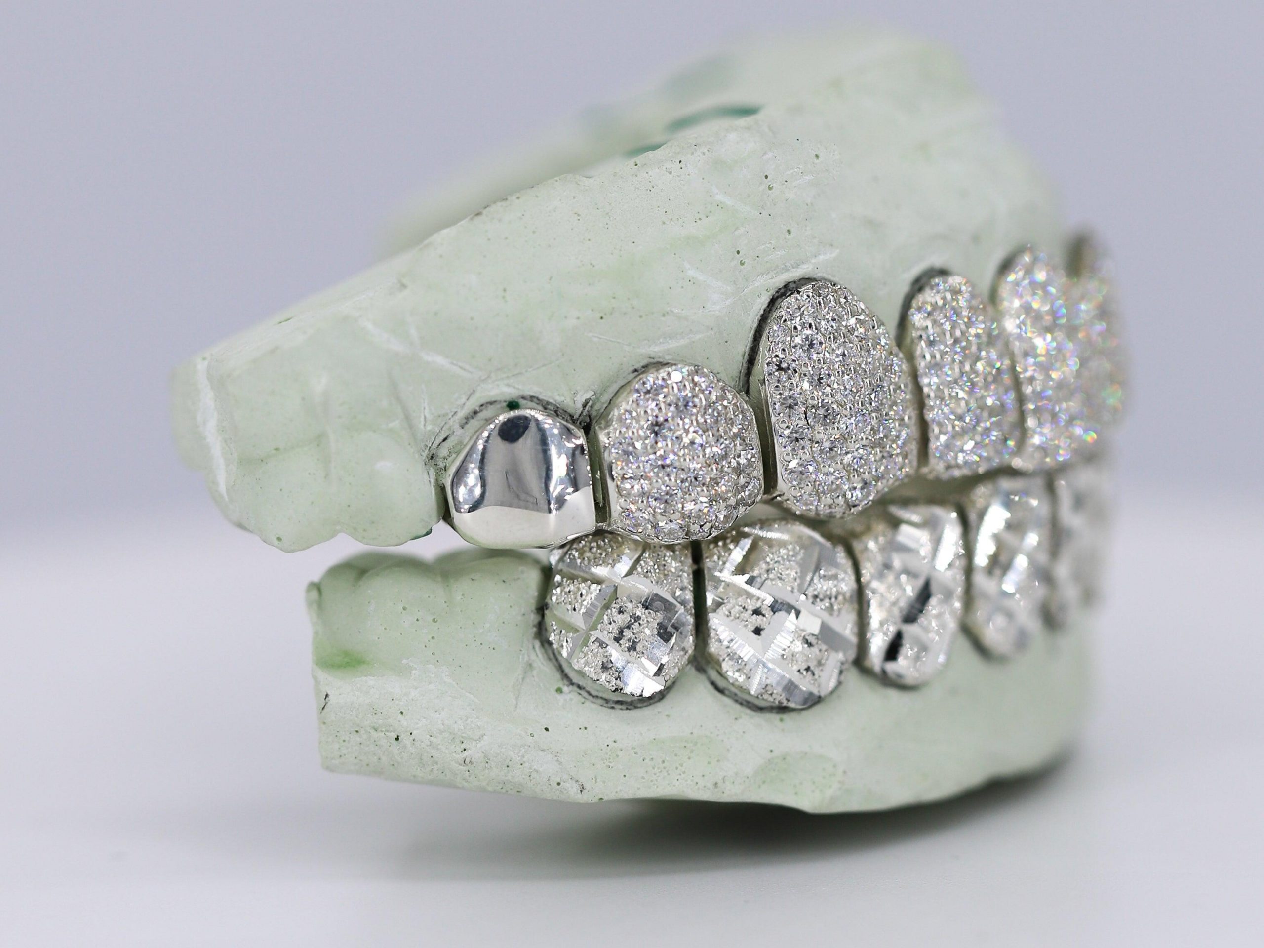 Custom Grillz Hand Set Moissanite Diamonds Top OR Bottom. These stunning pieces are a true work of art, featuring Moissanite diamonds of the finest quality and hand-set with the utmost attention to detail.