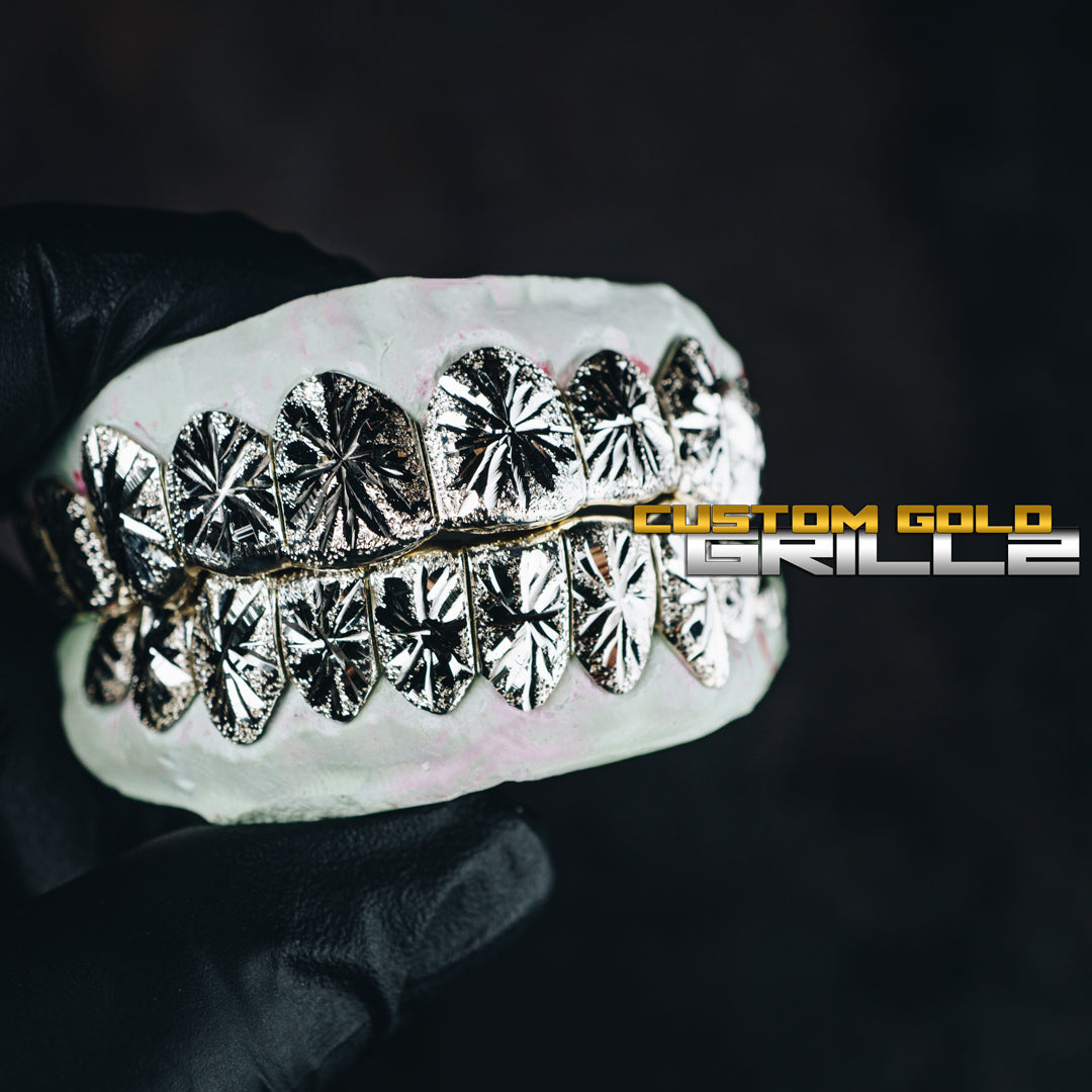 Tags: Custom Grillz, Deep Cut, Diamond Dust, Plating, Silver, Starburst Cut